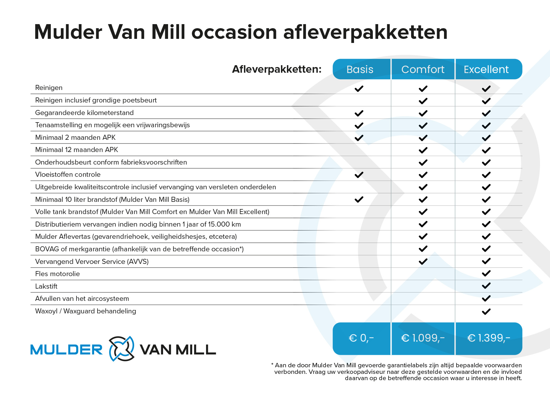 * Aan de door Mulder Van Mill gevoerde garantie labels zijn altijd bepaalde voorwaarden verbonden. Vraag uw verkoopadviseur naar deze gestelde voorwaarden en de invloed daarvan op de betreffende occasion waar u interesse in heeft.