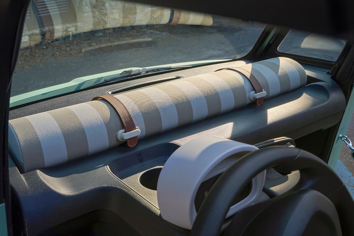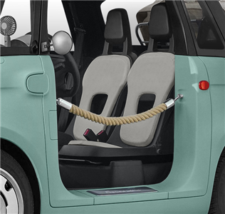 De gevlochten kabels, die in plaats van traditionele deuren worden gebruikt, geven de Fiat Topolino een open en luchtig karakter. Dit zorgt voor een unieke rijbeleving, waarbij u op zonnige voorjaarsdagen extra geniet van uw omgeving.